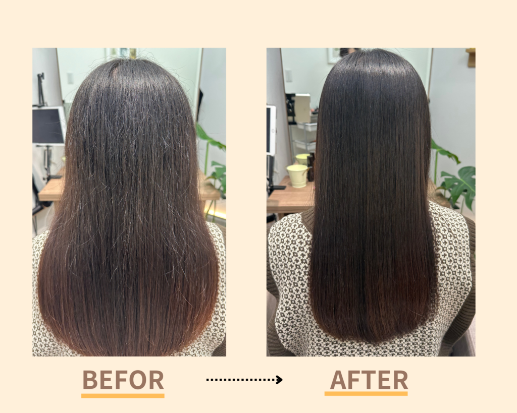 このように、ツヤツヤした髪にするには、縮毛矯正で髪をまっすぐに伸ばし、その後に必要な栄養を与える過程が大切です。