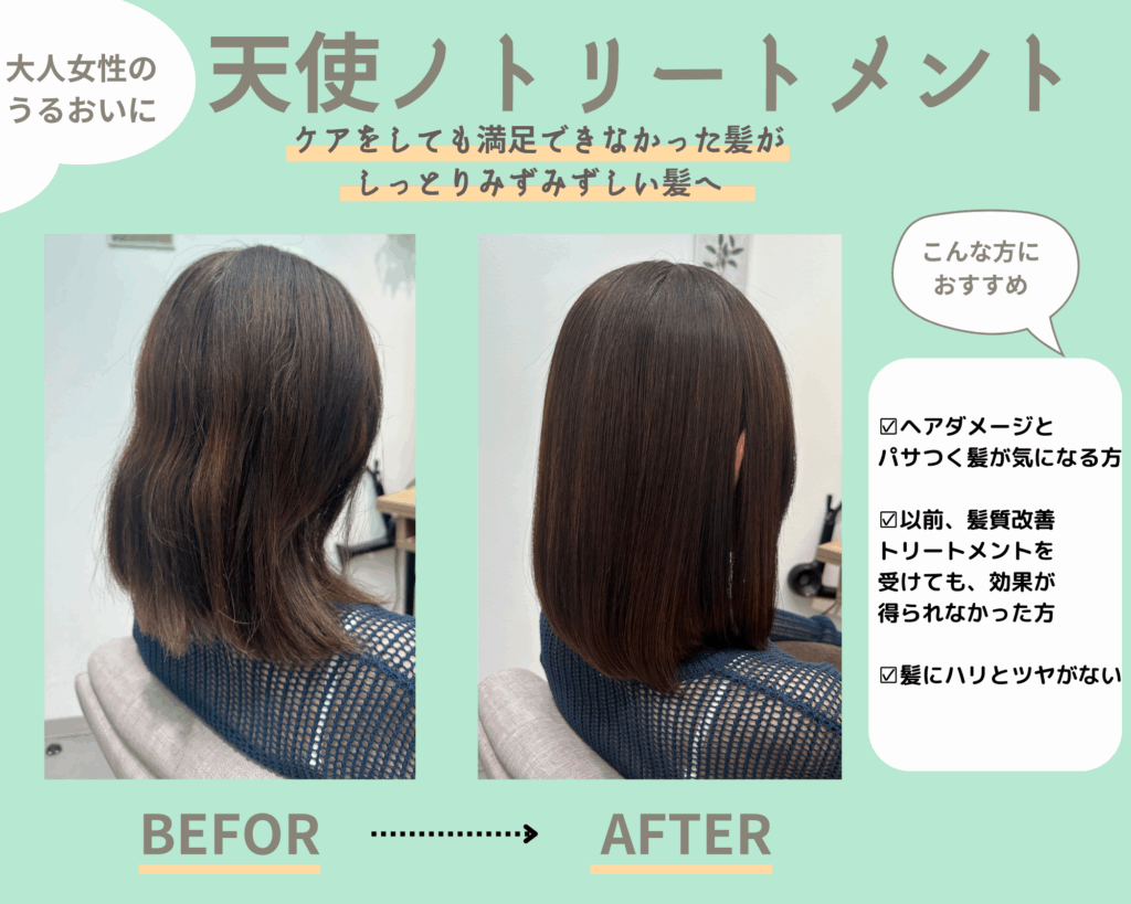 「これまでホームケアをがんばっても髪の広がり・パサパサ髪が気になる方」「美容室で髪質改善トリートメントを受けてもあまり効果を感じなかった方」におすすめしているのが「天使ノトリートメント」です。
