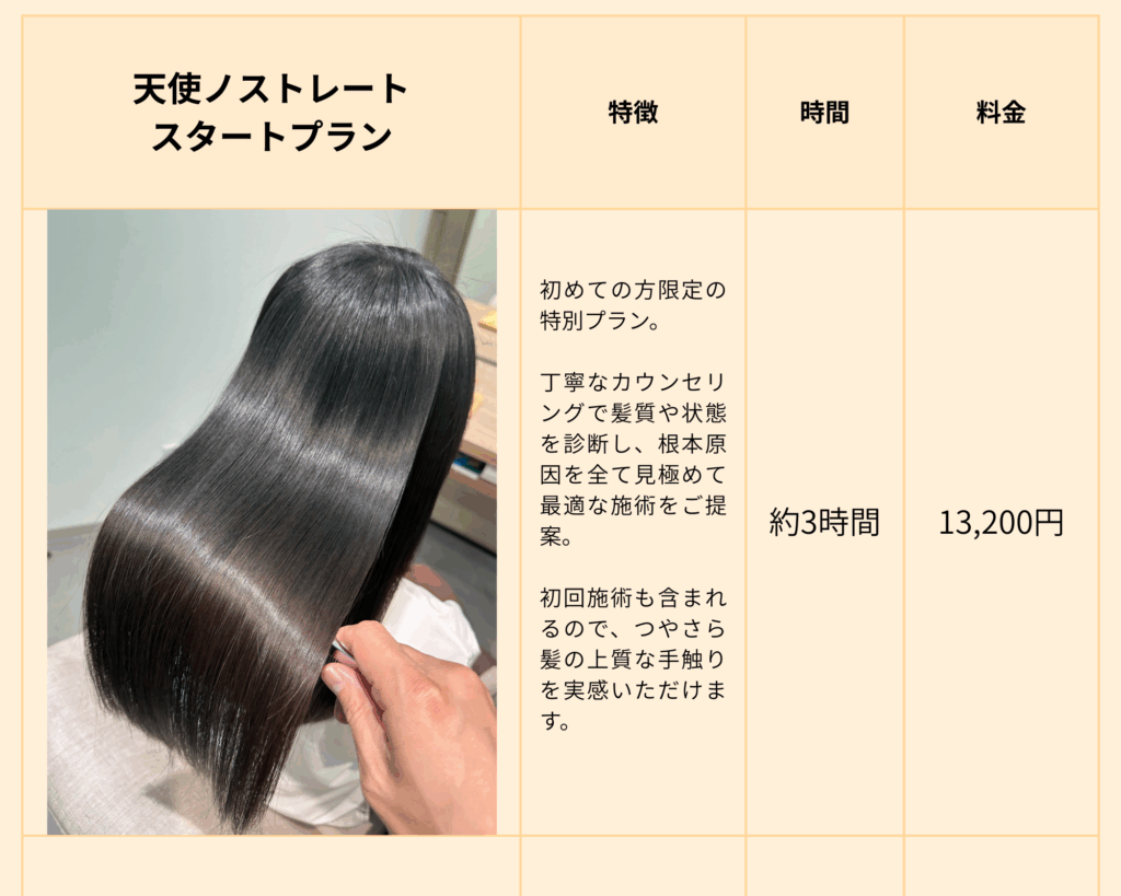 そこで当店が、お客様1人ひとりの髪の悩みを解決するプログラムを開発したのが「天使ノストレート スタートプラン」です。