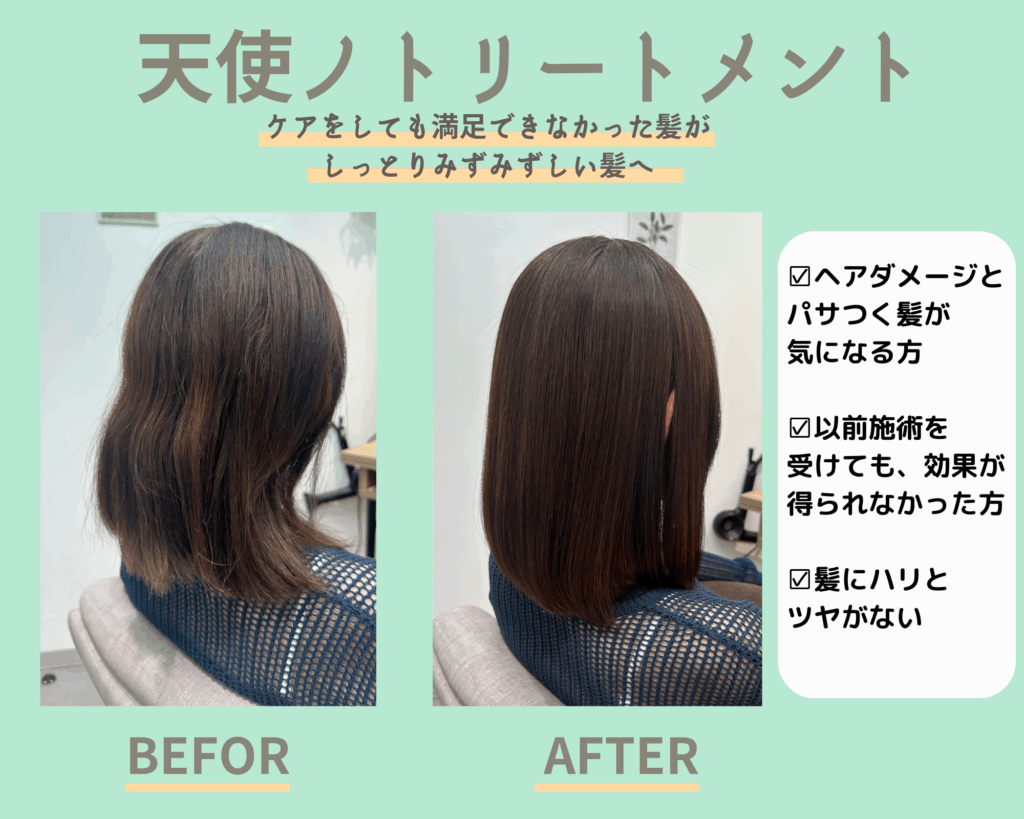 自然で内側からツヤツヤした髪になりたい方は、ぜひ一度天使ノトリートメントをお試しください。
