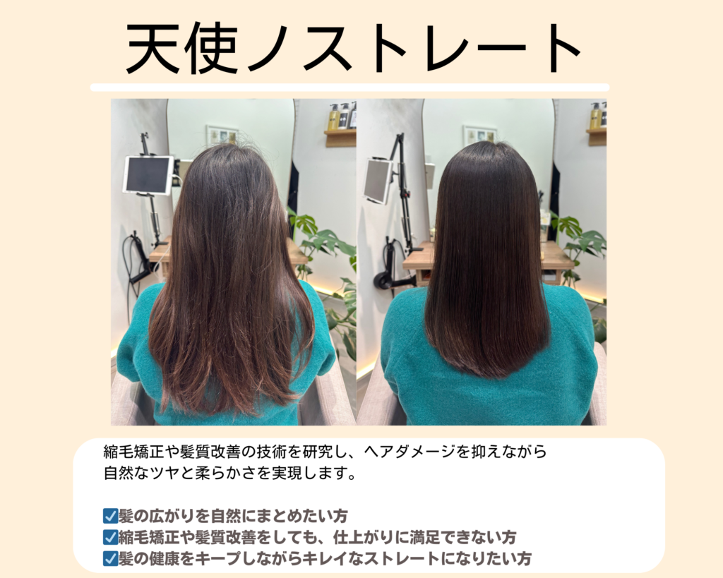 天使ノストレートとは、多様なトリートメント技術と質の高い「傷ませない」ストレート技術を組み合わせ、自然なストレートヘアへと導くメニューです。