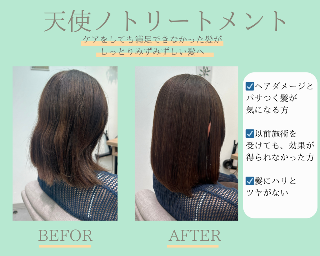 冬の乾燥によるパサつきを根本から解決したい方へ、ぜひ体験していただきたいのが当サロンの「天使ノトリートメント」です。