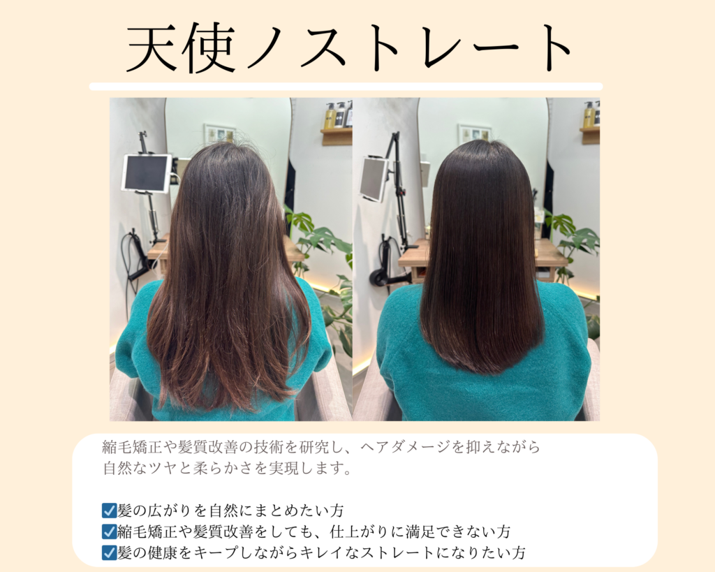 天使ノストレートとは、高度な技術で髪のうねりや広がりを改善し、自然なサラサラストレートヘアへ導くメニューです。